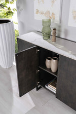 Le plateau en céramique de marbre Calacatta donne une touche de luxe et de raffinement à ce buffet, tandis que la structure en MDF plaqué chêne garantit solidité et résistance dans le temps. Les pieds en métal donnent une touche moderne et légère au design global.