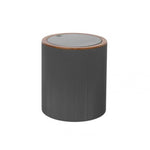 Récipient gris d'une capacité de 5 litres. L'objet a un design extrêmement contemporain et minimaliste. La poubelle est finie dans une couleur grise et un effet bois brun sur le dessus. Il est recommandé de manipuler l'ouverture avec douceur pour éviter tout dommage.