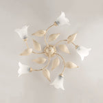 Plafonnier en fer Ivoire Or cinq lumières Albâtre Verre blanc 70x h20 cm