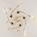 Plafonnier en fer Ivoire Or avec verres Ambre Blanc cinq lumières 70x h15 cm