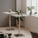Table haute carrée h.105 cm plateau blanc et piètement chrome