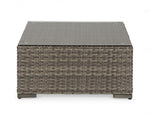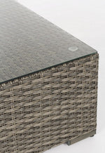 structure en aluminium, thermolaqué (polyester), tissage en fibres synthétiques. plateau en verre trempé. Pieds réglables.