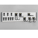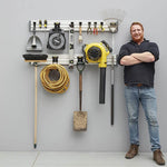 Organisateur d'outils conçu pour ranger soigneusement tous les outils, outils électriques, accessoires de jardinage et tout ce qui se trouve dans votre garage. Système entièrement personnalisable et intégrable puisqu'il est possible d'ajouter de nombreux accessoires et autres rails.