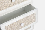 Mdf. Façade de tiroir recouverte de tissu (coton/lin). Fini avec de la peinture à base d'eau. Boutons en métal. Pieds à assembler. Tailles = 38a - 30.5b - 72.5h