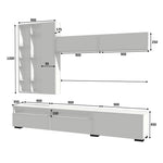 Dimensions de la base du meuble TV avec 3 rabats et 2 compartiments visibles