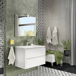Meuble de salle de bain suspendu, équipé de deux tiroirs de 80 cm à fermeture amortie. L'évier est en céramique. Le miroir est inclus dans le prix.