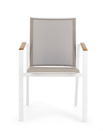 cadre en aluminium, revêtement en poudre (polyester). accoudoirs avec inserts en teck. assise et dossier rembourrés en textilène phifer 1x1. empilable.