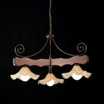 Lustre ancien en bois de noyer et fer trois lumières abat-jour verre 80x h50 cm