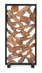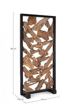 Structure en bois Meranti, panneau interne en racines de teck avec finition à base d'eau. Les formes créées par le bois ne sont qu'indicatives, tous les produits seront différents les uns des autres. Pieds à assembler. Mesures = 100a - 9/40b - 200h