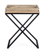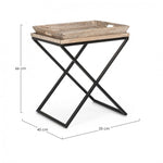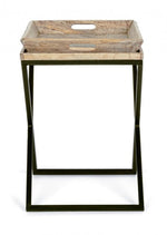 Struttura in acciaio, piano in legno di mango. Articolo provvisto di un vassoio estraibile. Dimensioni: 55 x 45 x h66 cm.