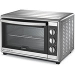 Four électrique d'une grande capacité de 56 litres, avec six positions de cuisson, équipé d'une minuterie réglable jusqu'à 120 minutes, d'un sélecteur de température jusqu'à 230 ° C et d'une fonction de ventilation pour la cuisson combinée des aliments. La fonction rôtisserie pour la préparation des poulets à la broche et l'éclairage intérieur, utile pour contrôler l'avancement de la cuisson, en font un appareil indispensable pour votre cuisine. Accessoires : Lèchefrite, tournebroche, ramasse-miettes, poignées pour extraire les accessoires