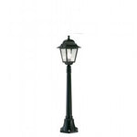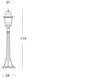 Poteau en aluminium moulé sous pression. Diffuseurs en verre transparent. Hauteur maximale du lampadaire : 210mm. Triangle de fixation au sol. Alimentation 230 V ~ 50 Hz. Classe de protection : IP43. Puissance maximale des lampes : 100W.