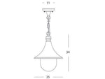 Suspension en aluminium moulé sous pression. Diffuseur thermoplastique transparent. Câble d'alimentation H05RN-F 3G1. Hauteur maximale de la lampe : 150 mm. Alimentation 230 V ~ 50 Hz. Classe de protection : IP43 Puissance maximale de la lampe : 60 W