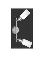 Le plafonnier MARS par Trio Lighting a une structure en métal couleur nickel mat composée d'une base ronde, d'un bras linéaire et de 2 spots orientables avec abat-jours cylindriques en verre blanc.