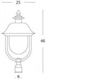 Lampadaire extérieur en aluminium moulé avec couvercle supérieur en cuivre gris. Le lampadaire est doté d'une structure en aluminium moulé et d'un diffuseur en plastique transparent. Le manchon a un diamètre de 60 mm et la hauteur maximale de la lampe est de 150 mm. Il fonctionne avec une alimentation de 230 V ~ 50 Hz et a une classe de protection IP43. La puissance maximale des lampes est de 100W.
