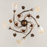 Plafonnier en fer Marron Or avec verres Ambre Blanc cinq lumières 70x h15 cm