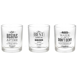 - Ce set de 3 verres aux écritures assorties est idéal pour servir de l'eau ou des boissons gazeuses et softs, et peut être combiné avec les autres verres à cocktail, ainsi qu'avec les autres accessoires qui complètent la gamme : plateaux hors d'oeuvre, plateaux mini palette et des accessoires textiles pour un en place vraiment cool !