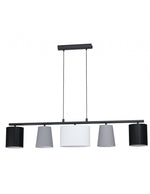 La lampe à suspension de la marque EGLO, modèle ALMEIDA, a un design avec une bascule en métal noir et 5 diffuseurs en tissu de différentes formes et tailles, disponibles en blanc, noir et anthracite.