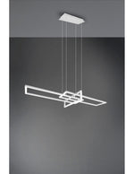 La suspension SALINAS par Trio Lighting a une structure en métal finition blanc mat avec une rosace rectangulaire, des fils orientables et un diffuseur formé de trois rectangles entrecroisés.