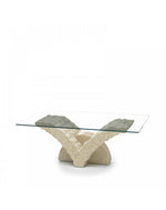 MATÉRIAUX : Dessus : Verre trempé bord poli Pieds / Base : Pierre fossile d'agate blanche Pieds Structure : Contreplaqué marine