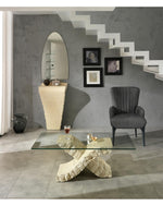 MATÉRIAUX : Dessus : Verre trempé bord poli Pieds / Base : Pierre fossile d'agate blanche Pieds Structure : Contreplaqué marine
