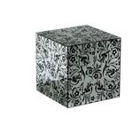 Table basse miroir damassé Détails techniques: Bois de matériau MDF dessus de miroir tissu damassé couleurs dominantes blanc / noir MESURE: 40 x 40 x h 40 cm